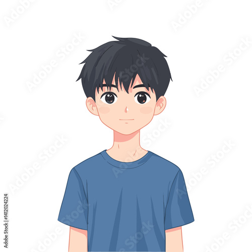 Cartoon boy with dark hair in blue t-shirt vector illustration