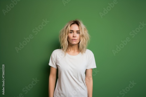 Casual Blonde Woman on a Solid Green Background. Generative AI.