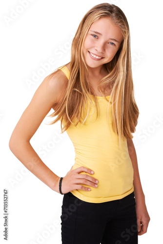 Casual, fashion or portrait of happy girl teenager in studio isolated on white background with pose. Pride, cool child or confident model with smile, modern style or trendy clothes with hand on hip