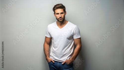 Casual male model with short hair and stubble wears a plain white tee shirt, standing relaxed with hands in pockets against a plain background.
