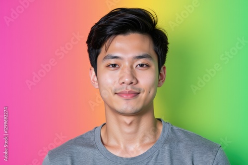 Casual Portrait of a Smiling Young Asian Man with Black Hair Against a Vibrant Gradient Background of Pink and Green Hues