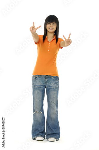 casual woman standing isolated showing victory hand sign