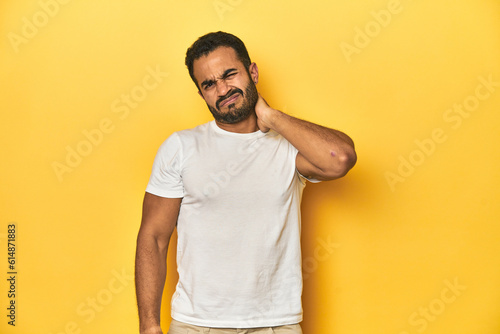 Casual young Latino man against a vibrant yellow studio background, having a neck pain due to stress, massaging and touching it with hand.