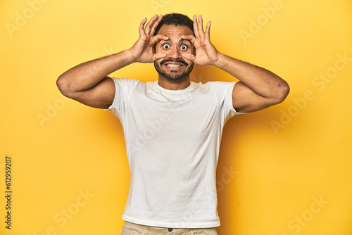 Casual young Latino man against a vibrant yellow studio background, keeping eyes opened to find a success opportunity.