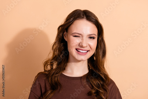 Casual young woman winking with a playful smile on beige background showcasing a trendy and stylish casual look.