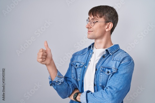 Caucasian blond man standing wearing glasses looking proud, smiling doing thumbs up gesture to the side