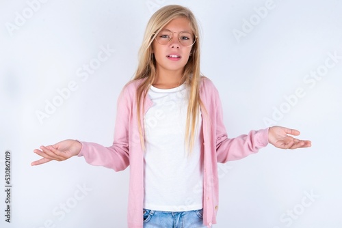caucasian blonde little girl wearing pink jacket and glasses over white background looks uncertain shrugs shoulders.