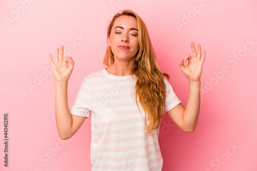 Caucasian blonde woman isolated on pink background relaxes after hard working day, she is performing yoga.