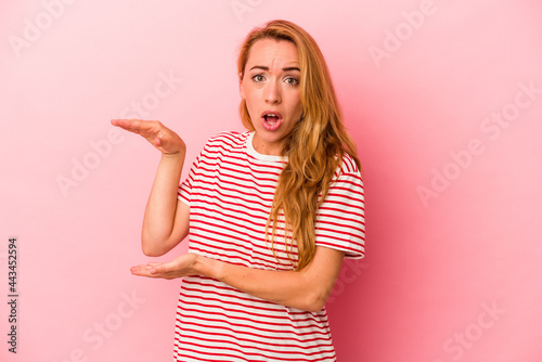 Caucasian blonde woman isolated on pink background shocked and amazed holding a copy space between hands.