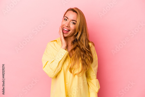 Caucasian blonde woman isolated on pink background shouts loud, keeps eyes opened and hands tense.