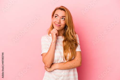 Caucasian blonde woman isolated on pink background thinking and looking up, being reflective, contemplating, having a fantasy.