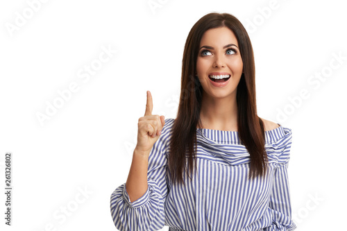 Caucasian brunette woman having fun and smiling isolated over white background