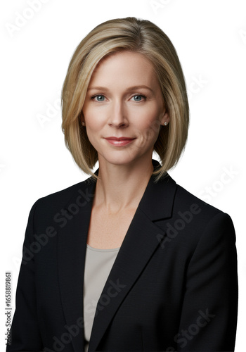 Caucasian businesswoman, late 30s, sleek bob, dark blazer, subtle smile, direct gaze, isolated on clean transparent studio background with high-key lighting, concept of corporate professionalism