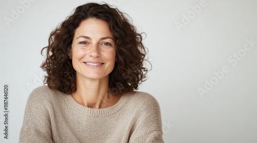 Caucasian female mature adult smiling in beige sweater on neutral background