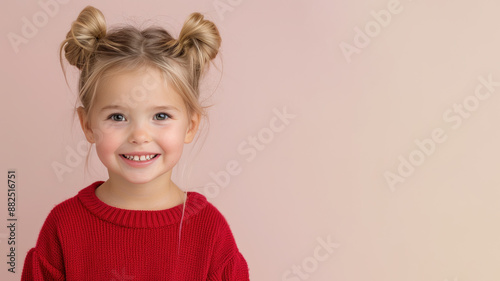 Caucasian girl in red sweater smile to copy space for text for advertising