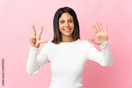 Caucasian girl isolated on pink background counting eight with fingers