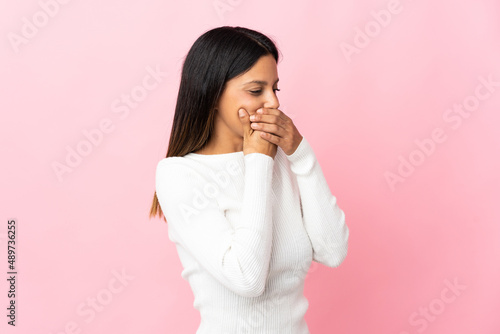 Caucasian girl isolated on pink background covering mouth and looking to the side