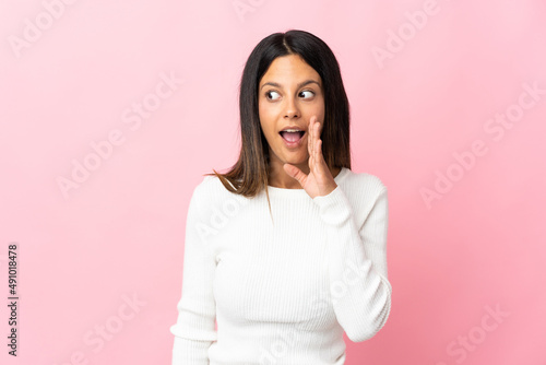 Caucasian girl isolated on pink background whispering something with surprise gesture while looking to the side