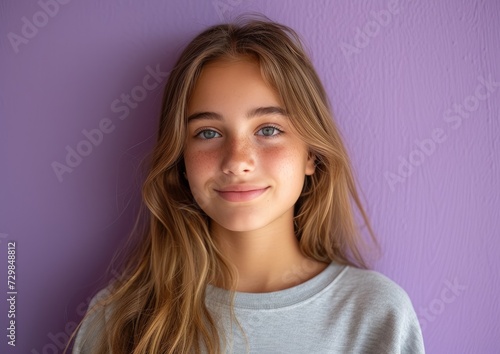 caucasian girl with colorful sweatshirt in professional colorful photo studio background
