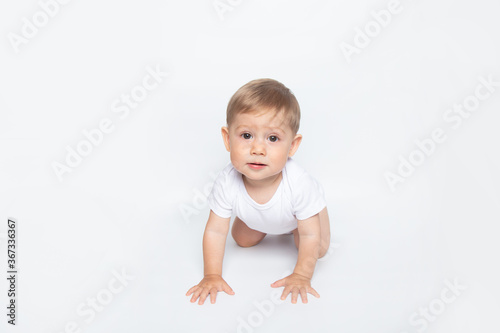 Caucasian hairy baby boy in white t-shirt crawls on all fours on white background