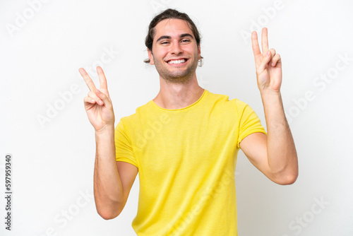 Caucasian handsome man isolated on white background showing victory sign with both hands
