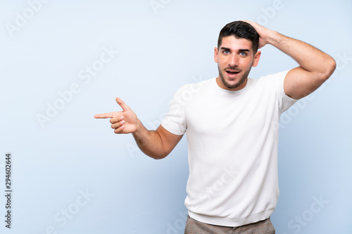 Caucasian handsome man over isolated blue background surprised and pointing finger to the side