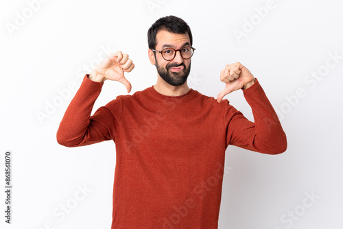Caucasian handsome man with beard over isolated white background showing thumb down
