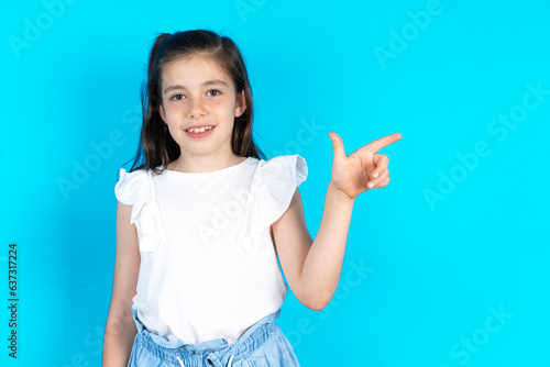 Caucasian kid girl wearing white t-shirt over blue background pointing up with fingers number eight in Chinese sign language BÄ.