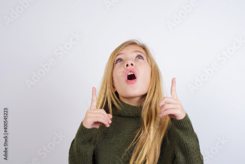 Caucasian kid girl wearing green knitted sweater against white wall amazed and surprised looking up and pointing with fingers and raised arms.