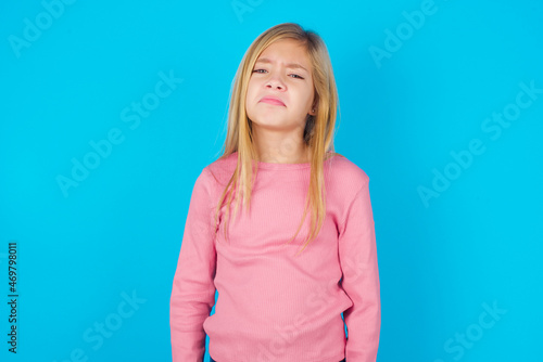 caucasian little kid girl wearing long sleeve shirt over blue background depressed and worry for distress, crying angry and afraid. Sad expression.