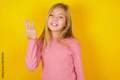 caucasian little kid girl wearing long sleeve shirt over yellow background smiling and looking friendly, showing number three or third with hand forward, counting down