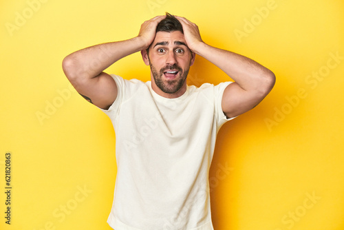 Caucasian man in white t-shirt on yellow studio background screaming, very excited, passionate, satisfied with something.