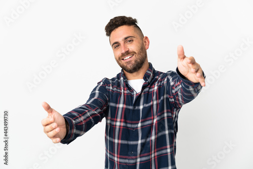 Caucasian man isolated on white background presenting and inviting to come with hand