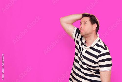 Caucasian man wearing casual striped t-shirt standing over isolated hot pink background shows various gestures.