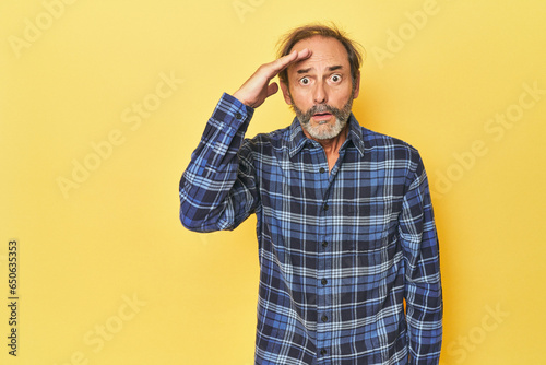 Caucasian middle-aged man in yellow studio shouts loud, keeps eyes opened and hands tense.