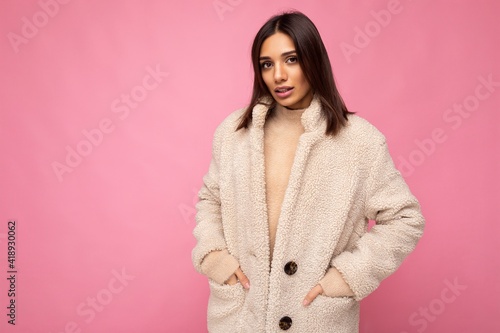 Caucasian photo of attractive self-confident stylish young brunette woman wearing autumn beaige warm coat isolated on pink background with empty space. Fashion concept