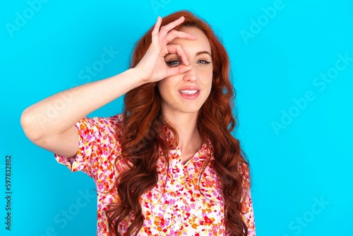 Caucasian redhead woman wearing floral dress over blue background with happy face smiling doing ok sign with hand on eye looking through finger.