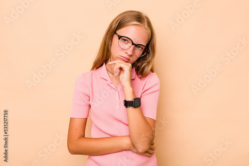 Caucasian teen girl isolated on beige background tired of a repetitive task.