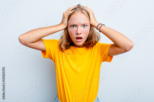 Caucasian teen girl isolated on blue background surprised and shocked.