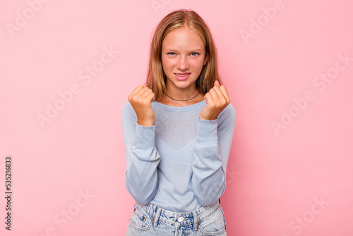 Caucasian teen girl isolated on pink background upset screaming with tense hands.