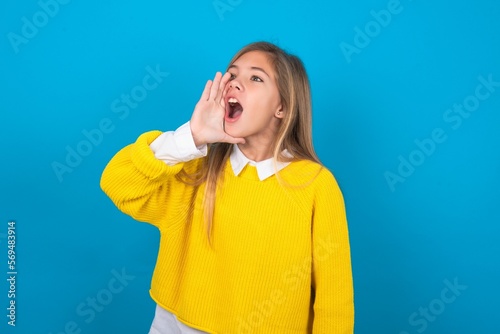 caucasian teen girl wearing yellow sweater over blue studio background shouting and screaming loud to side with hand on mouth. Communication concept.