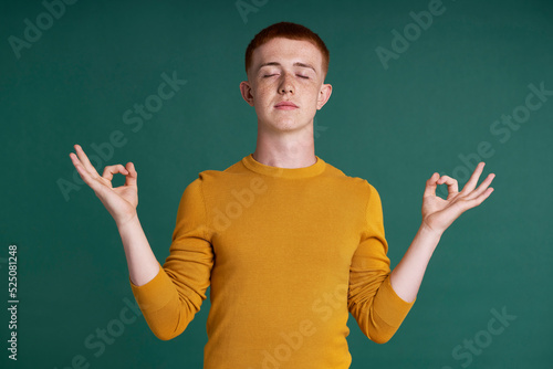 Caucasian teenage boy meditating with eyes closed on green background
