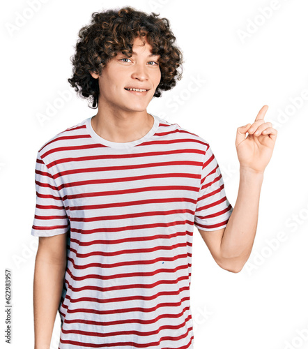 Caucasian teenager wearing casual clothes with a big smile on face, pointing with hand and finger to the side looking at the camera.