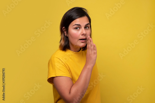 Caucasian woman covering mouth with hand tells secrets to someone, isolated on yellow wall.
