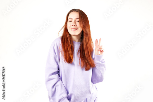 Caucasian woman in violet sweatshirt. Natural look. Smiling. long red hair. White background