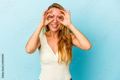 Caucasian woman isolated on blue background showing okay sign over eyes