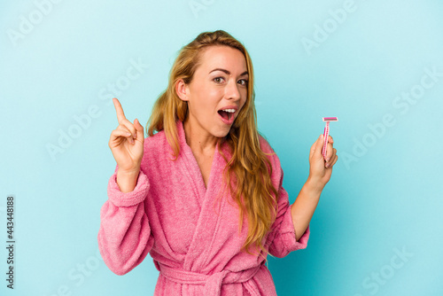 Caucasian woman wearing a bathrobe holding razor blade isolated on pink background having an idea, inspiration concept.