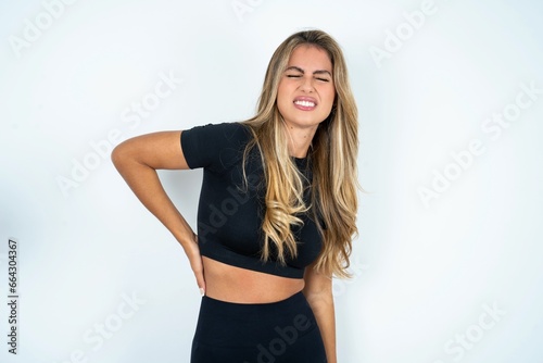 caucasian woman wearing sport clothes Suffering of backache, touching back with hand, muscular pain