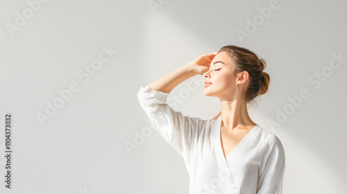 Caucasian young female in white shirt enjoying sunlight in minimalist setting