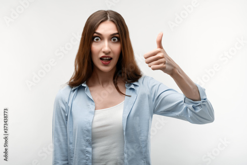 Caucasian Young female with long chestnut hair, dressed in casual clothes, shows OKAY sign, demonstrates approval